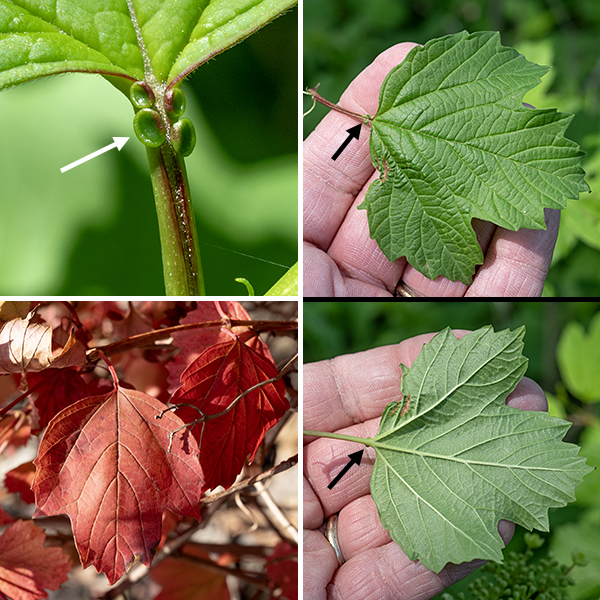 American cranberry (Viburnum opulus) leaves. Right: A single American cranberry leaf showing the upper surface of the leaf (top image) and the underside of the same leaf (bottom image). Note the three prominent, pointed lobes on the leaf. The arrows point to one of the extrafloral nectaries. Top left: a close-up of the extrafloral nectaries (arrow) on an American cranberry petiole. Bottom left: autumn color on leaves of American cranberry in mid-November.
