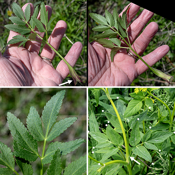Golden alexanders (Zizia aurea) stems and leaves. Bottom right: a stem of golden alexanders with a single compound leaf attached to the far side of the stem. The basal sheath of the leaf petiole is indicated with an arrow; each of the 14 leaflets in this leaf is marked with a white dot at the tip of the leaflet. Top: a single compound leaf of golden alexanders showing the upper surface of the leaf (left image) and the underside of the same leaf (right image). The sheath on the end of the petiole is indicated by a white arrow. Bottom left: a closer view of the six leaflets at the tip of the leaf figured above.